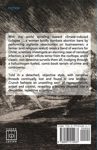 With the world spiraling toward climate-induced collapse ... a woman boldly combats abortion bans by performing vigilante vasectomies on businessmen; a farmer (and religious zealot) raises a band of warriors for Christ; scientists investigate an alarming case of nanobot infection; a sniper inflicts terror from the rooftops; and a classic, noir detective surveils them all, trudging through a hallucinogen-fueled, comic-book terrain of crime and controversy. Told in a detached, objective style, with narrative threads continually lost and found in one another, Crunch fashions an unsettling swirl of representation, action and control, revealing a society churned into a desperate, repetitive scramble.