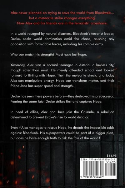 Alex never planned on trying to save the world from Bloodweb . . . but a meteorite strike changes everything. Now Alex and his friends are in the terrorists' crosshairs. In a world ravaged by natural disasters, Bloodweb's terrorist leader, Drake, seeks world domination amid the chaos, crushing any opposition with formidable forces, including his zombie army. Who can match his strength? Most have lost hope. Yesterday, Alex was a normal teenager in Asteria, a lawless city, though safer than most. He merely attended school and looked forward to flirting with Hope. Then the meteorite struck, and today Alex can manipulate energy, Hope can transform matter, and their friend Jace has super speed and strength. Drake has seen these powers before-they destroyed his predecessor. Fearing the same fate, Drake strikes first and captures Hope. In need of allies, Alex and Jace join the Crusade, a rebellion determined to prevent Drake's rise to world dictator. Even if Alex manages to rescue Hope, he dreads the impossible odds against Bloodweb. His superpowers could be part of a bigger plan, but does he have enough faith to risk the fate of the world?