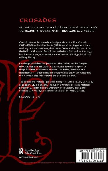 Routledge publishes this journal for The Society for the Study of the Crusades and the Latin East. Particular attention is given to the publication of historical sources - narrative, homiletic and documentary - but studies and interpretative essays are welcomed too. Crusades also incorporates the Society's Bulletin. The editors are Professor Jonathan Phillips, Royal Holloway, University of London, UK; Iris Shagrir, The Open University of Israel; Professor Benjamin Z. Kedar, Hebrew University of Jerusalem, Israel; and Nikolaos G. Chrissis, Democritus University of Thrace, Greece.
