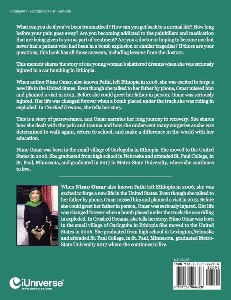 What can you do if youve been traumatized? How can you get back to a normal life? How long before your pain goes away? Are you becoming addicted to the painkillers and medication that are being given to you as part of treatment? Are you a doctor or hoping to become one but never had a patient who had been in a bomb explosion or similar tragedies? If those are your questions, this book has all those answers, including lessons from the doctors. This memoir shares the story of one young womans shattered dreams when she was seriously injured in a car bombing in Ethiopia. When author Nimo Omar, also known Fathi, left Ethiopia in 2006, she was excited to forge a new life in the United States. Even though she talked to her father by phone, Omar missed him and planned a visit in 2013. Before she could greet her father in person, Omar was seriously injured. Her life was changed forever when a bomb placed under the truck she was riding in exploded. In Crushed Dreams, she tells her story. This is a story of perseverance, and Omar narrates her long journey to recovery. She shares how she dealt with the pain and trauma and how she underwent many surgeries as she was determined to walk again, return to school, and make a difference in the world with her education. Nimo Omar was born in the small village of Garloguba in Ethiopia. She moved to the United States in 2006. She graduated from high school in Nebraska and attended St. Paul College, in St. Paul, Minnesota, and graduated in 2017 in Metro-State University, where she continues to live.