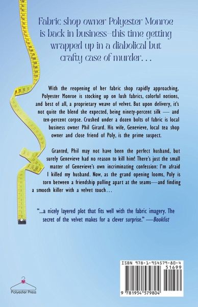 Fabric shop owner Polyester Monroe is back in business--this time getting wrapped up in a diabolical but crafty case of murder. With the reopening of her fabric shop rapidly approaching, Polyester Monroe is stocking up on lush fabrics, colorful notions, and best of all, a proprietary weave of velvet. But upon delivery, it's not quite the blend she expected, being ninety-percent silk - and ten-percent corpse. Crushed under a dozen bolts of fabric is local business owner Phil Girard. His wife, Genevieve, local tea shop owner and close friend of Poly, is the prime suspect. Granted, Phil may not have been the perfect husband, but surely Genevieve had no reason to kill him! There's just the small matter of Genevieve's own incriminating confession: I'm afraid I killed my husband. Now, as the grand opening looms, Poly is torn between a friendship pulling apart at the seams-and finding a smooth killer with a velvet touch...