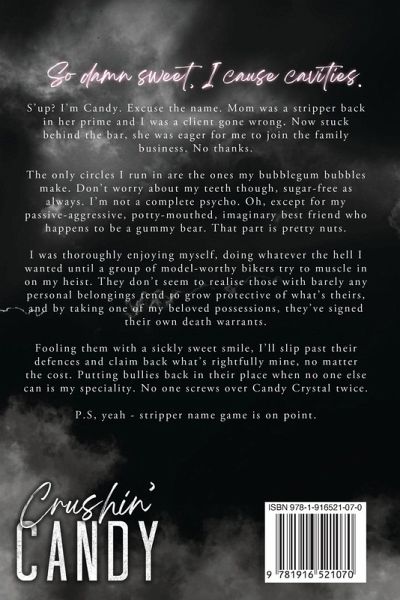 So damn sweet, I cause cavities. S'up? I'm Candy. Excuse the name. Mom was a stripper back in her prime and I was a client gone wrong. Now stuck behind the bar, she was eager for me to join the family business. No thanks. The only circles I run in are the ones my bubblegum bubbles make. Don't worry about my teeth though, sugar-free as always. I'm not a complete psycho. Oh, except for my passive-aggressive, potty-mouthed, imaginary best friend who happens to be a gummy bear. That part is pretty nuts. I was thoroughly enjoying myself, doing whatever the hell I wanted until a group of model-worthy bikers try to muscle in on my heist. They don't seem to realise those with barely any personal belongings tend to grow protective of what's theirs, and by taking one of my beloved possessions, they've signed their own death warrants. Fooling them with a sickly sweet smile, I'll slip past their defences and claim back what's rightfully mine, no matter the cost. Putting bullies back in their place when no one else can is my speciality. No one screws over Candy Crystal twice. P.S, yeah - stripper name game is on point. Trigger Warning: This is book one of the I Love Candy series, featuring a feisty female lead. Candy is spontaneous, impulsive and reckless, which makes this book inappropriate for under 18's. She gives as good as she gets, causing chaos and leaves you wondering who is bullying who! Expect excessive amounts of steam, violence and cursing throughout. This series is a Why Choose trilogy with a HEA...eventually.