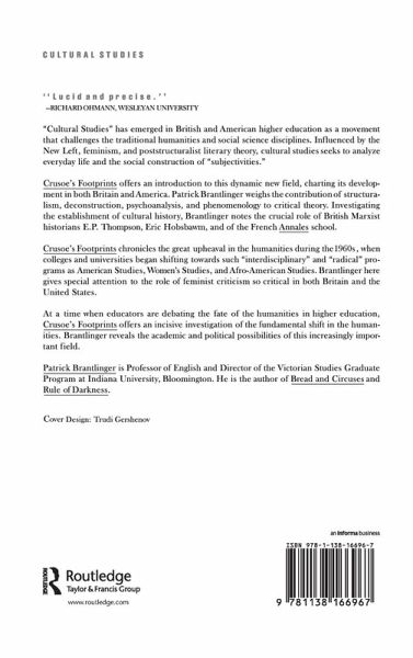 "Cultural Studies" has emerged in British and American higher education as a movement that challenges the traditional humanities and social science disciplines. Influenced by the New Left, feminism, and poststructualist literary theory, cultural studies seeks to analyze everday life and the social construction of "subjectivities." Crusoe's Footprints encompasses the movement of many colleges and universities in the 1960s towards such interdisciplinary and "radical" programs as American Studies, Women's Studies, and Afro-American Studies. Brantlinger also examines the role of feminist criticism which has been particularly crucial in both Britain and the U.S.