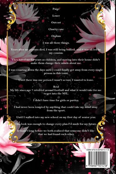 Paige ¿Loner Outcast Charity case Orphan I was all those things. Years after my parents died, I was still being bullied, and it was all led by my cousins. They hated me for years as children, and moving into their house didn't make them change their minds about me. I was counting down the days until I could finally get away from every single person in this town. Until there was one person I wasn't so sure I wanted to leave. Reid My life since age 7 revolved around football and what it would take for me to get into the NFL. I didn't have time for girls or parties. I had never been tempted by anything that could take my mind away from the sport. Until I walked into my new school on my first day of senior year. One look was enough to change every plan I'd made for my future. It wasn't long before we both realized that someone didn't like that we had found each other.