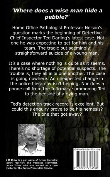 ‘Where does a wise man hide a pebble?’ Home Office Pathologist Professor Nelson’s question marks the beginning of Detective Chief Inspector Ted Darling’s latest case. Not one he was expecting to get for him and his team. The tragic but seemingly straightforward suicide of a young man. It’s a case where nothing is quite as it seems. There’s no shortage of potential suspects. The trouble is, they all alibi one another. The case is going nowhere. An unexpected change in the police hierarchy isn’t helping. Nor does a phone call from the Infirmary summoning Ted to the bedside of a dying man. Ted’s detection track record is excellent. But could this enquiry prove to be his nemesis? The one that got away