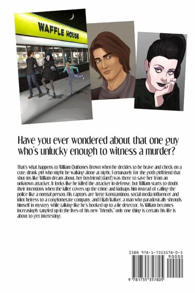 Have you ever wondered about that one guy who's unlucky enough to witness a murder? That's what happens to William Quiñones Brown when he decides to be brave and check on a cute, drunk girl who might be walking alone at night. Fortunately for the goth girlfriend that shut-ins like William dream about, her boyfriend (darn!) was there to save her from an unknown attacker. It looks like he killed the attacker in defense, but William starts to doubt their intentions when the killer covers up the crime and kidnaps him instead of calling the police like a normal person. His captors are Arete Konstantinou, social media influencer and idiot heiress to a conglomerate company, and Elijah Walker, a man who paradoxically shrouds himself in mystery while talking like he's hooked up to a lie detector. As time passes, William becomes increasingly obsessed with his captors, tangling himself in their lives at the detriment of his own identity.