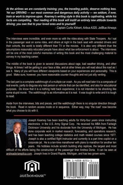 The interviews were incredible, and even more so with the rides-along with state troopers, deputies, and local police. As I sat in the passenger seat on some rides, and others at night in the back seat with arrested drivers and their cohorts, the world is totally different than TV or the movies. It is also very different than the assumptions reasonably educated people have about what law enforcement is about. The interviews will be one of the most colorful memories of writing this book and the most challenging material to convey in my teaching career. The middle of the book is given to several discussions about rage, bad weather driving, and other things as you can see in the table of contents. At times I will be getting into your face a little, and at other times you will read about the road as I see it. Many of you will have different viewpoints based on your experiences and personality. This is good. Make sure, however, you have reasonable counter thoughts and not just silly venting. The last part is a complete walkthrough of a multiple car crash. As you will read later it is a composite of real events, partly to disguise any real person or vehicle that can be identified, and also for educational purposes. Do know that it is a nothing held back experience; it is not intended to be shocking like some stupid movie. The walkthrough is as informative as it is real. It was tough to write and it is tough to read. Aside from the interviews, bits and pieces, and the walkthrough there is no singular direction through the book. Read in random access mode or in sequence. Either way, may "the road" now become what you choose to do with it.