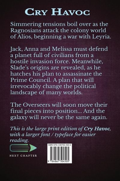 Simmering tensions boil over as the Ragnosians attack the colony world of Alios, beginning a war with Leyria. Jack, Anna and Melissa must defend a planet full of civilians from a hostile invasion force. Meanwhile, Slade's origins are revealed, as he hatches his plan to assassinate the Prime Council. A plan that will irrevocably change the political landscape of many worlds. The Overseers will soon move their final pieces into position... And the galaxy will never be the same again. This is the large print edition of Cry Havoc, with a larger font / typeface for easier reading.