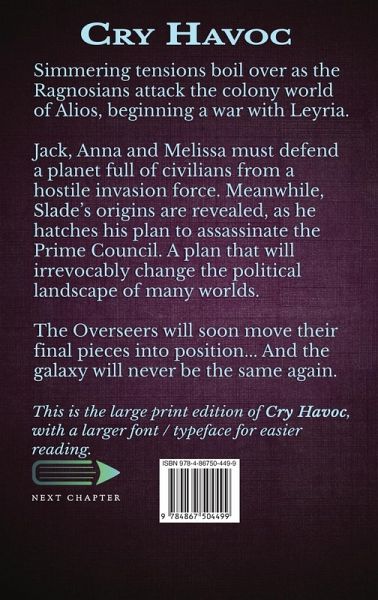 Simmering tensions boil over as the Ragnosians attack the colony world of Alios, beginning a war with Leyria. Jack, Anna and Melissa must defend a planet full of civilians from a hostile invasion force. Meanwhile, Slade's origins are revealed, as he hatches his plan to assassinate the Prime Council. A plan that will irrevocably change the political landscape of many worlds. The Overseers will soon move their final pieces into position... And the galaxy will never be the same again. This is the large print edition of Cry Havoc, with a larger font / typeface for easier reading.