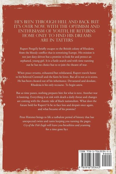 "There's a saying. Hear the cry of the fish eagle and you'll always come back. Bush fever. Call it what you will. That sound is the most beautiful sound on earth. It's worse than booze or drugs. Addictive. Totally addictive." Flying Officer Rupert Pengelly briefly escapes war to the British colony of Rhodesia. His mission not just duty-driven but a promise to look for an orphaned young girl, Sasa Savage. Having disappeared into the African bush with her eccentric grandfather, she is lost to him and with time running out he rejoins the theatre of war. When peace returns, Rupert travels home to his beloved Cornwall and the farm he loves, only to learn he has been cruelly cheated out of his inheritance by his distant cousin. Devastated and desolate. Rupert is torn. Can he keep a pledge to a dead man and return to Rhodesia continuing the search for the missing girl? Will the cry of the fish eagle call to him?