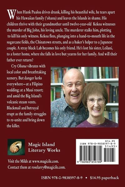 When Hank Pualoa drives drunk, killing his beautiful wife, he tears apart his Hawaiian family ('ohana) and leaves the Islands in shame. His children thrive with their grandmother until twelve-year-old Kekoa witnesses the murder of Big John, his loving uncle. The murderer stalks him, plotting to kill his only witness. Kekoa flees, plunging into a hand-to-mouth life in the sugarcane fields, the Chinatown streets, and as a baker's helper to a Japanese couple. A stray black Lab becomes his only friend. He's lost his sister, Leilani, to a foster home, where she falls in love but yearns for her family. And will their father ever return? Cry Ohana vibrates with local color and breathtaking scenery. But danger lurks everywhere-at a Filipino wedding; at a Maui resort; and amid the Big Island's volcanic steam vents. Blackmail and betrayal erupt as the family struggles to re-unite and bring down the killer.