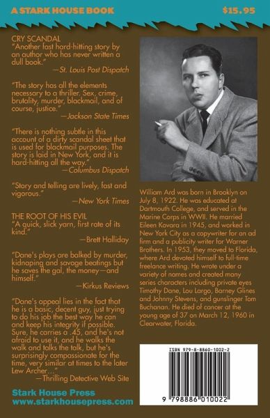 CRY SCANDAL It all begins when Timothy Dane's former partner goes missing. He and Barney Glines had been private investigators but had parted company over Gline's shady tactics. However, Gline's secretary is worried, so Dane starts to dig. The more Dane uncovers, the dirtier Glines begins to look. He's been working with a sleazy magazine called Info that specializes in celebrity gossip, taking their dirty secrets and dealing a little blackmail on the side. Soon Dane is working for a group of theater producers who want Info shut down for good. Then it becomes personal when Dane falls for a Broadway starlet who is next in line for the Info treatment. It all leads back to Barney Glines-who is nowhere to be found. THE ROOT OF HIS EVIL Johnny Cashman is trying to put together the deal of a lifetime by investing in a Latin American general who is willing to trade arms for his country's gambling concessions in a takeover bid. But to make this happen, Cashman needs cash. So he starts to pull in some gambling debts, including the $200,000 that singer Buddy Lewis owes him. Buddy can only scrape together $100,000 but it's enough to send Timothy Dane down to Florida to trade the cash for Buddy's markers. Trouble is, the current Latin American regime doesn't want a takeover, and are prepared to do whatever is necessary to stop Dane. And if that weren't distraction enough, there's Lissa, Cashman's girl-one hell of a distraction.