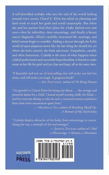 A self-described crybaby who sees the end of the world lurking around every corner, Cheryl E. Klein has relied on planning and hard work to reach her goals and avoid catastrophe. But when she finds her wish for a baby dashed over and over - first by infertility, then miscarriage, and finally breast cancer - her carefully structured life, marriage, friendships, and belief system begin to crumble. Adding a detour through the fickle world of open adoption seems like the last thing she should do, but where she lacks control, she finds adventure. Empathetic, candid, and often humorous, Crybaby: Infertility, Illness and Other Things That Were not the End of the World is the story of what happens when a failed perfectionist and successful hypochondriac is forced to make room in her life for grief and joy, fear and hope, all at the same time.