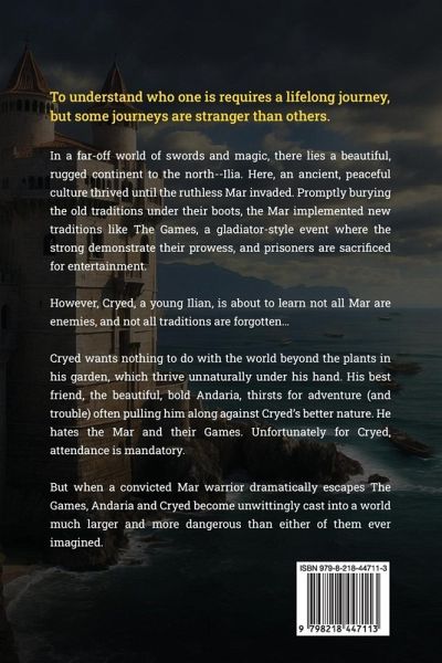 In a far off world of swords and magic, there lies a beautiful, rugged continent to the north-Ilia. Here, an ancient, peaceful culture thrived until the ruthless Mar invaded. Promptly burying the old traditions under their boots, the Mar implemented new traditions like The Games, a gladiator-style event where the strong demonstrate their prowess, and prisoners are sacrificed for entertainment. However, Cryed, a young Ilian, is about to learn not all Mar are enemies, and not all traditions are forgotten... Cryed wants nothing to do with the world beyond the plants in his garden, which thrive unnaturally under his hand. His best friend, the beautiful, bold Andaria, thirsts for adventure (and trouble) often pulling him along against Cryed's better nature. He hates the Mar and their Games. Unfortunately for Cryed, attendance is mandatory. But when a convicted Mar warrior dramatically escapes The Games, Andaria and Cryed become unwittingly cast into a world much larger and more dangerous than either of them ever imagined.