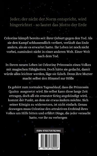 Jeder, der nicht der Norm entspricht, wird hingerichtet - so lautet das Motto der Erde. Celestine kämpft bereits seit ihrer Geburt gegen den Tod. Als sie den Kampf schlussendlich verliert, verläuft das Ende anders, als sie es erwartet hatte. Ihr Leben ist noch nicht vorbei, zumindest nicht in einer anderen Welt. Einer Welt nach dem Tod. In ihrem neuen Leben ist Celestine Prinzessin eines Volkes mit magischen Fähigkeiten. Doch hätte sie gedacht, damit würde alles leichter werden, hatte sie sich geirrt. Denn ihre Mutter macht selbst den Himmel zur Hölle. Es gehört zum normalen Tagesablauf, dass die Prinzessin Qualen ausgesetzt wird. Sie selbst kann es lange Zeit ertragen, doch als ein erneuter Krieg angekündigt wird, kommt der Punkt, an dem sie etwas ändern möchte. Sich seiner Königin zu widersetzten, ist nicht einfach. Genau deswegen muss Celestine den attraktiven Erzfeind ihres Volkes um Hilfe bitten und erfährt Dinge, die jeder versucht hatte, vor ihr zu verbergen.