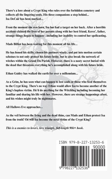 There's a lore about a Crypt King who rules over the forbidden cemetery and collects all the lingering souls. His three companions a step behind... Isa DeCuir has been marked... From the moment she was born, Isa has had a target on her back. After a horrible accident claimed the lives of her parents along with her best friend, Keres', father, strange things began to happen-including her inability to control her spellcasting. Mads Billiot has been waiting for this moment all his life... He has honed his skills, chosen his partners wisely, and put into motion certain schemes to not only protect his future bride, but to also break the network of witches within the Grand Du Parish. However, there is a nasty secret buried with the dead that threatens everything he's accomplished along with his future bride. Ethan Guidry has walked the earth for over a millennium... As a Grim, he has seen what can happen to lost souls or those who feed themselves to the Crypt King. There's no way Ethan would allow Isa to become another of the King's hapless victim. He'd do anything for the Witchling including becoming her familiar and sharing his life with her. However, there are strange happenings afoot, and his wishes might truly be nightmares. All Hallows Eve approaches... As the veil between the living and the dead thins, can Mads and Ethan protect Isa from the truth? Or will Isa become the next victim of the Crypt King? This is a enemies to lovers, love triangle, full-length 95k+ book.