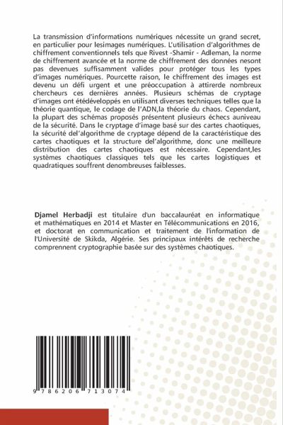 La transmission d'informations numériques nécessite un grand secret, en particulier pour lesimages numériques. L'utilisation d'algorithmes de chiffrement conventionnels tels que Rivest -Shamir - Adleman, la norme de chiffrement avancée et la norme de chiffrement des données nesont pas devenues suffisamment valides pour protéger tous les types d'images numériques. Pourcette raison, le chiffrement des images est devenu un défi urgent et une préoccupation à attirerde nombreux chercheurs ces dernières années. Plusieurs schémas de cryptage d'images ont étédéveloppés en utilisant diverses techniques telles que la théorie quantique, le codage de l'ADN,la théorie du chaos. Cependant, la plupart des schémas proposés présentent plusieurs échecs auniveau de la sécurité. Dans le cryptage d'image basé sur des cartes chaotiques, la sécurité del'algorithme de cryptage dépend de la caractéristique des cartes chaotiques et la structure del'algorithme, donc une meilleure distribution des cartes chaotiques est nécessaire. Cependant,les systèmes chaotiques classiques tels que les cartes logistiques et quadratiques souffrent denombreuses faiblesses.