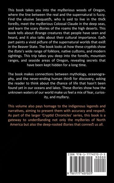 This book takes you into the mysterious woods of Oregon, where the line between the real and the supernatural is fuzzy. Find the elusive Sasquatch, who is said to live in the thick forests, meet the mysterious Colossal Claude in the deep seas, and learn the scary stories of the roams the high deserts. This book tells about strange creatures that people have seen and heard, and it also talks about their cultural importance. Each part paints a vivid picture of the supernatural worlds that exist in the Beaver State. The book looks at how these cryptids show the state's wide range of folklore, native customs, and modern sightings. This trip takes you deep into the forests, mountain ranges, and seaside areas of Oregon, revealing secrets that have been kept hidden for a long time. The book makes connections between mythology, oceanography, and the never-ending human thirst for discovery, asking the reader to think about the chance of life that hasn't been found yet in our oceans and lakes. These stories show how the unknown waters of our world make us feel a mix of fear, curiosity, and mystery. This volume also pays homage to the indigenous legends and narratives, aiming to present them with accuracy and respect. As part of the larger 'Cryptid Chronicles' series, this book is a gateway to understanding not only the mysteries of North America but also the deep-rooted stories that connect us all.