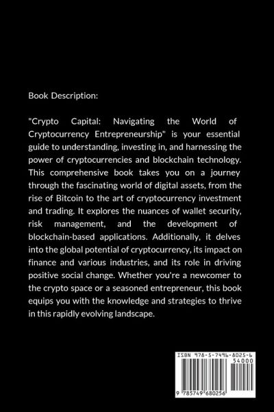 "Crypto Capital: Navigating the World of Cryptocurrency Entrepreneurship" is your essential guide to understanding, investing in, and harnessing the power of cryptocurrencies and blockchain technology. This comprehensive book takes you on a journey through the fascinating world of digital assets, from the rise of Bitcoin to the art of cryptocurrency investment and trading. It explores the nuances of wallet security, risk management, and the development of blockchain-based applications. Additionally, it delves into the global potential of cryptocurrency, its impact on finance and various industries, and its role in driving positive social change. Whether you're a newcomer to the crypto space or a seasoned entrepreneur, this book equips you with the knowledge and strategies to thrive in this rapidly evolving landscape.