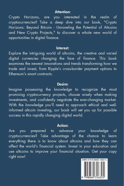 Crypto Horizons, are you interested in the realm of cryptocurrencies? Take a deep dive into our book, "Crypto Horizons: Beyond Bitcoin - Unraveling the Potential of Altcoins and New Crypto Projects," to discover a whole new world of opportunities in digital finance. Explore the intriguing world of altcoins, the creative and varied digital currencies changing the face of finance. This book examines the newest innovations and trends transforming how we trade and invest, from Ripple's cross-border payment options to Ethereum's smart contracts. Imagine possessing the knowledge to recognize the most promising cryptocurrency projects, choose wisely when making investments, and confidently negotiate the ever-changing market. With the knowledge you'll need to approach ethical and well-informed altcoin investing, our book will set you up for possible success in this rapidly changing digital world. Are you prepared to advance your knowledge of cryptocurrencies? Take advantage of the chance to learn everything there is to know about altcoins and how they can affect the world's financial system. Invest in your education and use altcoins to improve your financial situation.
