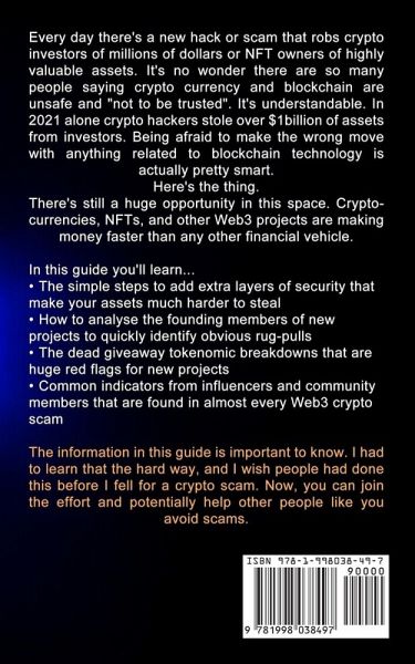 Every day there's a new hack or scam that robs crypto investors of millions of dollars or NFT owners of highly valuable assets. It's no wonder there are so many people saying crypto currency and blockchain are unsafe and "not to be trusted". It's understandable. In 2021 alone crypto hackers stole over $1billion of assets from investors. Being afraid to make the wrong move with anything related to blockchain technology is actually pretty smart. Here's the thing. There's still a huge opportunity in this space. Cryptocurrencies, NFTs, and other Web3 projects are making money faster than any other financial vehicle. In this guide you'll learn...The simple steps to add extra layers of security that make your assets much harder to steal How to analyse the founding members of new projects to quickly identify obvious rug-pulls The dead giveaway tokenomic breakdowns that are huge red flags for new projects Common indicators from influencers and community members that are found in almost every Web3 crypto scam The information in this guide is important to know. I had to learn that the hard way, and I wish people had done this before I fell for a crypto scam. Now, you can join the effort and potentially help other people like you avoid scams. This guide will also be very useful for anyone who knows of a scummy crypto project, and wants to know how to report them.