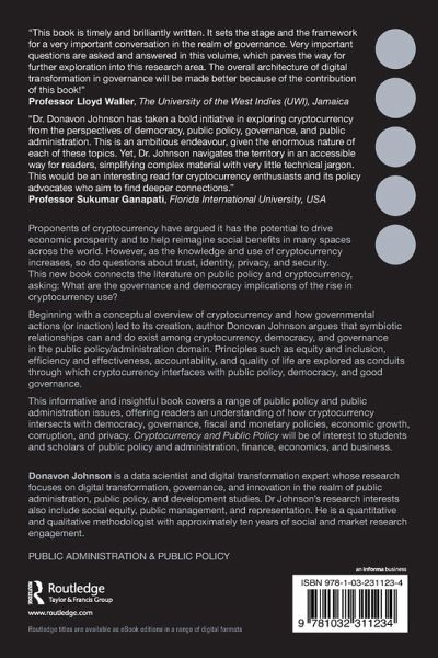"Dr. Donavon Johnson has taken a bold initiative in exploring cryptocurrency from the perspectives of democracy, public policy, governance, and public administration. This is an ambitious endeavour, given the enormous nature of each of these topics. Yet, Dr. Johnson navigates the territory in an accessible way for readers, simplifying complex material with very little technical jargon. This would be an interesting read for cryptocurrency enthusiasts and its policy advocates who aim to find deeper connections." - Professor Sukumar Ganapati, Florida International University, USA
