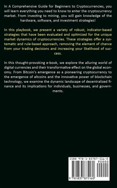 In A Comprehensive Guide for Beginners to Cryptocurrencies, you will learn everything you need to know to enter the cryptocurrency market. From investing to mining, you will gain knowledge of the hardware, software, and investment strategies! In this playbook, we present a variety of robust, indicator-based strategies that have been evaluated and optimized for the unique market dynamics of cryptocurrencies. These strategies offer a systematic and rule-based approach, removing the element of chance from your trading decisions and increasing your likelihood of success. In this thought-provoking e-book, we explore the alluring world of digital currencies and their transformative effect on the global economy. From Bitcoin's emergence as a pioneering cryptocurrency to the emergence of altcoins and the innovative power of blockchain technology, we examine the dynamic landscape of decentralized finance and its implications for individuals, businesses, and governments.