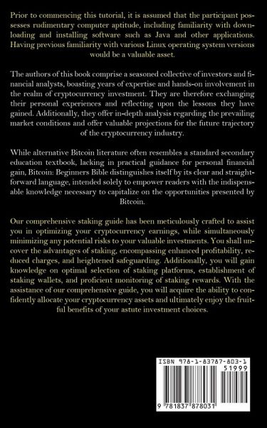 Prior to commencing this tutorial, it is assumed that the participant possesses rudimentary computer aptitude, including familiarity with downloading and installing software such as Java and other applications. Having previous familiarity with various Linux operating system versions would be a valuable asset. The authors of this book comprise a seasoned collective of investors and financial analysts, boasting years of expertise and hands-on involvement in the realm of cryptocurrency investment. They are therefore exchanging their personal experiences and reflecting upon the lessons they have gained. Additionally, they offer in-depth analysis regarding the prevailing market conditions and offer valuable projections for the future trajectory of the cryptocurrency industry. While alternative Bitcoin literature often resembles a standard secondary education textbook, lacking in practical guidance for personal financial gain, Bitcoin: Beginners Bible distinguishes itself by its clear and straightforward language, intended solely to empower readers with the indispensable knowledge necessary to capitalize on the opportunities presented by Bitcoin. Our comprehensive staking guide has been meticulously crafted to assist you in optimizing your cryptocurrency earnings, while simultaneously minimizing any potential risks to your valuable investments. You shall uncover the advantages of staking, encompassing enhanced profitability, reduced charges, and heightened safeguarding. Additionally, you will gain knowledge on optimal selection of staking platforms, establishment of staking wallets, and proficient monitoring of staking rewards. With the assistance of our comprehensive guide, you will acquire the ability to confidently allocate your cryptocurrency assets and ultimately enjoy the fruitful benefits of your astute investment choices.