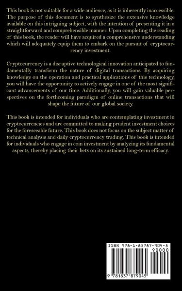This book is not suitable for a wide audience, as it is inherently inaccessible. The purpose of this document is to synthesize the extensive knowledge available on this intriguing subject, with the intention of presenting it in a straightforward and comprehensible manner. Upon completing the reading of this book, the reader will have acquired a comprehensive understanding which will adequately equip them to embark on the pursuit of cryptocurrency investment. Cryptocurrency is a disruptive technological innovation anticipated to fundamentally transform the nature of digital transactions. By acquiring knowledge on the operation and practical applications of this technology, you will have the opportunity to actively engage in one of the most significant advancements of our time. Additionally, you will gain valuable perspectives on the forthcoming paradigm of online transactions that will shape the future of our global society. This book is intended for individuals who are contemplating investment in cryptocurrencies and are committed to making prudent investment choices for the foreseeable future. This book does not focus on the subject matter of technical analysis and daily cryptocurrency trading. This book is intended for individuals who engage in coin investment by analyzing its fundamental aspects, thereby placing their bets on its sustained long-term efficacy.