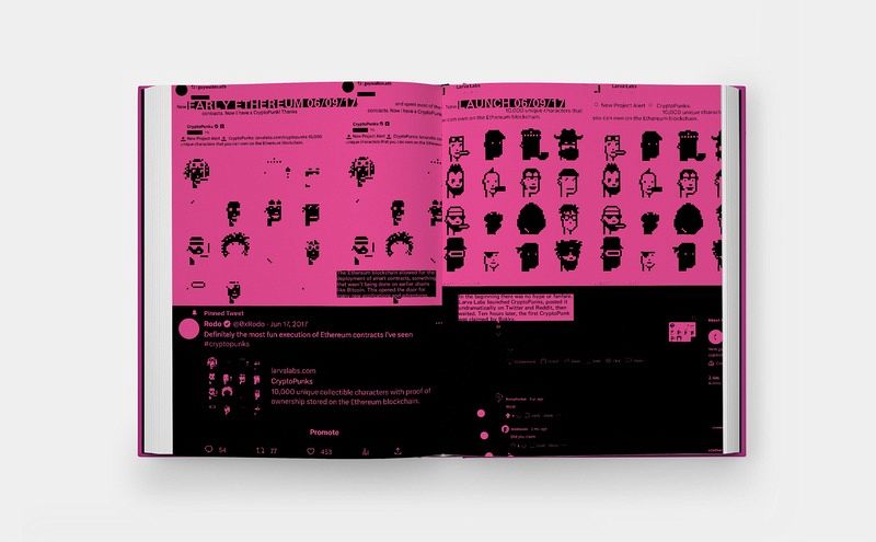 All 10,000 CryptoPunks are presented in a special 400+ page catalogue raisonné within this book, with a comprehensive listing including Punk, number, type, colors, attributes and image hash. A timeline provides a zine-like assemblage of community member posts and tweets as they happened; while an extensive glossary defines more than 100 anonymously authored terms and ideas with guest contributions from Beeple, Emily Segal, Venkatesh Rao, and more.