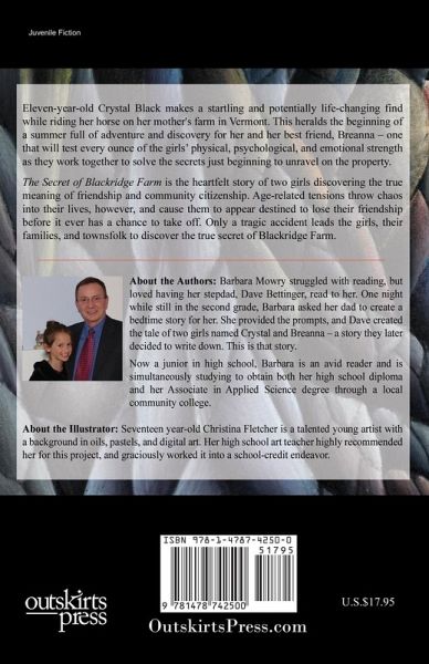 Eleven-year-old Crystal Black makes a startling and potentially life-changing find while riding her horse on her mother's farm in Vermont. This heralds the beginning of a summer full of adventure and discovery for her and her best friend, Breanna - one that will test every ounce of the girls' physical, psychological, and emotional strength as they work together to solve the secrets just beginning to unravel on the property. The Secret of Blackridge Farm is the heartfelt story of two girls discovering the true meaning of friendship and community citizenship. Age-related tensions throw chaos into their lives, however, and cause them to appear destined to lose their friendship before it ever has a chance to take off. Only a tragic accident leads the girls, their families, and townsfolk to discover the true secret of Blackridge Farm.