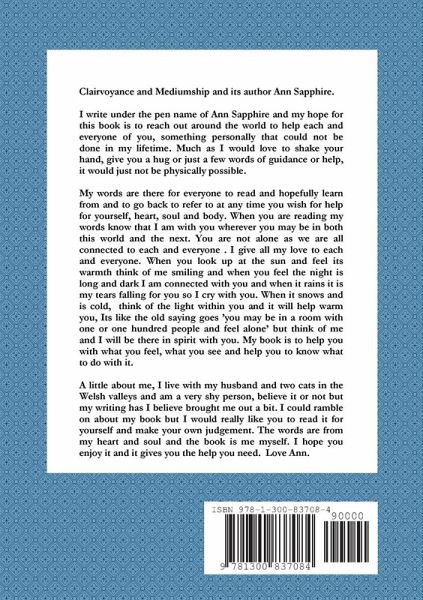 A guide book to self help on the subject of Clairvoyance and Mediumship by Ann Sapphire. My pen name is Ann Sapphire and my hope for this book is to reach out around the world to help each and everyone of you, something personally that could not be done in my lifetime. Much as I would love to shake your hand, give you a hug or just few words of guidance or help it would just not be physically possible. My words are there for everyone to read and hopefully learn from and to go back to refer to at any time you wish for help for yourself, heart, soul and body. When you are reading my words know that I am connected with you wherever you may be in both this world and the next. I could ramble on about my book but I would really like you to read it for yourself and make your own judgement. The words are from my heart and soul and the book is me myself. I hope you enjoy it and it gives you the help you need. Love Ann.
