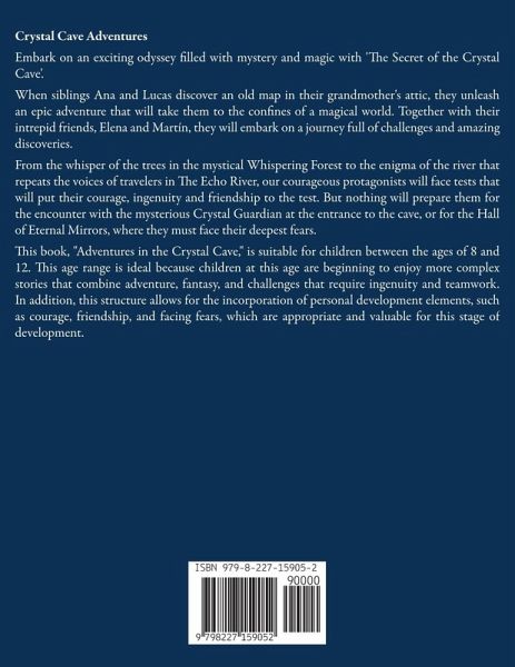 Crystal Cave Adventures Embark on an exciting odyssey filled with mystery and magic with 'The Secret of the Crystal Cave'. When siblings Ana and Lucas discover an old map in their grandmother's attic, they unleash an epic adventure that will take them to the confines of a magical world. Together with their intrepid friends, Elena and Martín, they will embark on a journey full of challenges and amazing discoveries. From the whisper of the trees in the mystical Whispering Forest to the enigma of the river that repeats the voices of travelers in The Echo River, our courageous protagonists will face tests that will put their courage, ingenuity and friendship to the test. But nothing will prepare them for the encounter with the mysterious Crystal Guardian at the entrance to the cave, or for the Hall of Eternal Mirrors, where they must face their deepest fears. This book, "Adventures in the Crystal Cave," is suitable for children between the ages of 8 and 12. This age range is ideal because children at this age are beginning to enjoy more complex stories that combine adventure, fantasy, and challenges that require ingenuity and teamwork. In addition, this structure allows for the incorporation of personal development elements, such as courage, friendship, and facing fears, which are appropriate and valuable for this stage of development.
