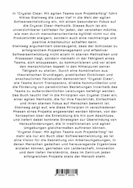 In "Crystal Clear: Mit agilen Teams zum Projekterfolg" führt Niklas Steinweg die Leser tief in die Welt der agilen Softwareentwicklung ein, mit einem besonderen Fokus auf die Crystal Clear-Methodik. Dieses Buch ist ein unverzichtbarer Leitfaden für jeden, der verstehen möchte, wie man durch menschenorientierte Agilität nicht nur die Produktivität steigern, sondern auch eine nachhaltige und positive Arbeitskultur schaffen kann.Steinweg argumentiert überzeugend, dass der Schlüssel zu erfolgreichem Projektmanagement und effektiver Softwareentwicklung nicht allein in starren Methodiken und…mehr