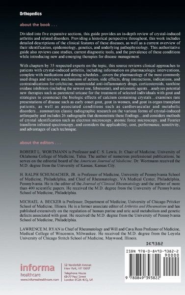 Crystal Induced Arthropathies--Historical Aspects. Epidemiology of Crystal-Induced Arthropathy. Genetics of Crystal-Induced Arthropathies. Clinical Features of Gout. Asymptomatic Hyperuricemia. Clinical Features of Calcium Pyrophosphate Dihydrate Crystal Deposition Disease. Clinical Features of Basic Calcium Phosphate-Associated Syndromes. Differential Diagnosis of Acute Monarthritis. Synovial Fluid Analysis for Identification of Crystals. Other Methods of Crystal Identification. Radiographic Changes of Crystal-induced Arthropathies. Biochemistry of Hyperuricemia and Gout.Biochemistry of Calcium Pyrophosphate Crystal Deposition. Biochemistry of Basic Calcium Phosphate Associated Syndromes. Pathophysiology of Crystal-Induced Arthritis. Urate Physiology. Pathophysiology and Biologic Effects of Crystals. Pathology of Crystal-Induced Arthritic Syndromes. Management of the Crystal-Induced Arthritic Syndromes. Colchicine. Nonsteroidal Anti-inflammatory Drugs. Corticosteroids. Uricosuric Agents. Xanthine Oxidase Inhibitors. Uricase. Therapeutic Agents for Calcium Crystal Arthropathies