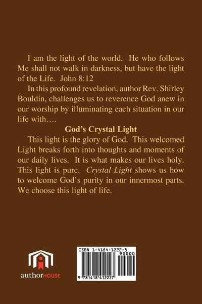 I am the light of the world. He who follows Me shall not walk in darkness, but have the light of the Life. John 8:12 In this profound revelation, author rev. Shirley Bouldin, challenges us to reverence God anew in our worship by illuminating each situation in our life with God's.. God's Crystal Light This light is the glory of God. This welcomed Light breaks forth into thoughts and moments of our daily lives. It is what makes our lives holy. This light is pure. Crystal Light shows us how to welcome God's purity in our innermost parts. We choose this light of life.