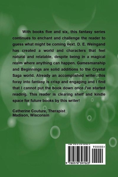 With books five and six, this fantasy series continues to enchant and challenge the reader to guess what might be coming next. D. E. Weingand has created a world and characters that feel natural and relatable, despite being in a magical realm where anything can happen. Gamesmanship and Beginnings are solid additions to the Crystal Saga world. Already an accomplished writer, this foray into fantasy is crisp and engaging and I find that I cannot put the book down once I've started reading. This reader is clearing shelf and kindle space for future books by this writer