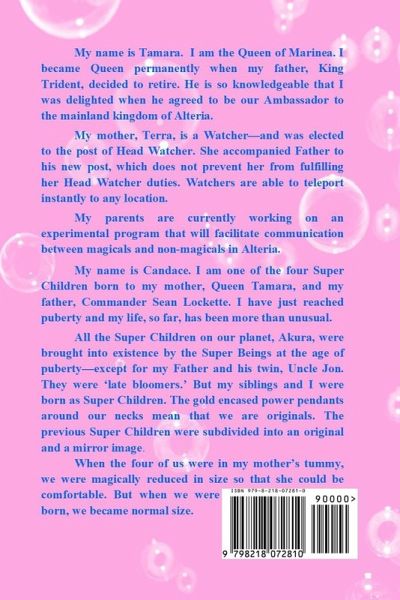 My name is Tamara. I am the Queen of Marinea. I became Queen permanently when my father, King Trident, decided to retire. He is so knowledgeable that I was delighted when he agreed to be our Ambassador to the mainland kingdom of Alteria. My mother, Terra, is a Watcher-and was elected to the post of Head Watcher. She accompanied Father to his new post, which does not prevent her from fulfilling her Head Watcher duties. Watchers are able to teleport instantly to any location. My parents are currently working on an experimental program that will facilitate communication between magicals and non-magicals in Alteria. My name is Candace. I am one of the four Super Children born to my mother, Queen Tamara, and my father, Commander Sean Lockette. I have just reached puberty and my life, so far, has been more than unusual. All the Super Children on our planet, Akura, were brought into existence by the Super Beings at the age of puberty-except for my Father and his twin, Uncle Jon. They were 'late bloomers.' But my siblings and I were born as Super Children. The gold encased power pendants around our necks mean that we are originals. The previous Super Children were subdivided into an original and a mirror image. When the four of us were in my mother's tummy, we were magically reduced in size so that she could be comfortable. But when we were born, we became normal size.