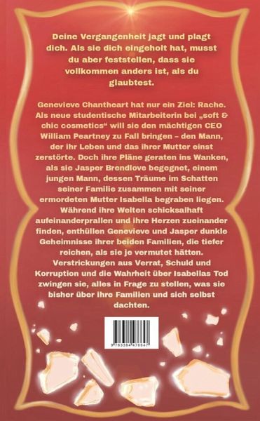 Genevieve Chantheart hat nur ein Ziel: Rache. Als neue studentische Mitarbeiterin bei "soft & chic cosmetics" will sie den mächtigen CEO William Peartney zu Fall bringen - den Mann, der ihr Leben und das ihrer Mutter einst zerstörte. Doch ihre Pläne geraten ins Wanken , als sie Jasper Brendlove begegnet, einem jungen Mann, dessen Träume im Schatten seiner Familie zusammen mit seiner ermordeten Mutter Isabella begraben liegen. Während ihre Welten schicksalhaft aufeinanderprallen und ihre Herzen zueinander finden, enthüllen Genevieve und Jasper dunkle Geheimnisse ihrer beiden Familien, die tiefer reichen, als sie je vermutet hätten. Verstrickungen aus Verrat, Schuld und Korruption und die Wahrheit über Isabellas Tod zwingen sie, alles in Frage zu stellen, was sie bisher über ihre Familien und sich selbst dachten. Hoffnungslos romantisch, poetisch, tiefgründig, emotional und gesellschaftskritisch. Enthält SpiceTropes: Romance Suspense Artist x Poet Elite College Romance (Harvard)He falls first Trauma Healing RomanceGreen Flag Bookboyfriend Good GuyWho did this to you? Mental HealthDark Past & Dark Secrets High Stakes Feminism