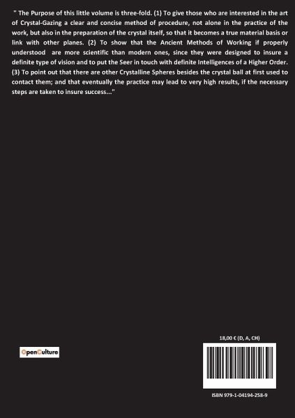 " The Purpose of this little volume is three-fold. (1) To give those who are interested in the art of Crystal-Gazing a clear and concise method of procedure, not alone in the practice of the work, but also in the preparation of the crystal itself, so that it becomes a true material basis or link with other planes. (2) To show that the Ancient Methods of Working if properly understood are more scientific than modern ones, since they were designed to insure a definite type of vision and to put the Seer in touch with definite Intelligences of a Higher Order. (3) To point out that there are other Crystalline Spheres besides the crystal ball at first used to contact them; and that eventually the practice may lead to very high results, if the necessary steps are taken to insure success..."