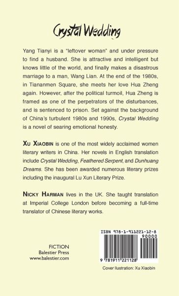 Yang Tianyi is a "leftover woman" and under pressure to find a husband. She is attractive and intelligent but knows little of the world, and finally makes a disastrous marriage to a man, Wang Lian. At the end of the 1980s, in Tiananmen Square, she meets her love Hua Zheng again. However, after the political turmoil, Hua Zheng is framed as one of the perpetrators of the disturbances, and is sentenced to prison. Set against the background of China's turbulent 1980s and 1990s, Crystal Wedding is a novel of searing emotional honesty. (Winner of English Pen Translates Award).