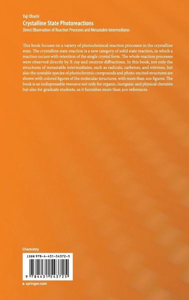 This book focuses on a variety of photochemical reaction processes in the crystalline state. The crystalline state reaction is a new category of solid state reaction, in which a reaction occurs with retention of the single crystal form. The whole reaction processes were observed directly by X-ray and neutron diffractions. In this book, not only the structures of metastable intermediates, such as radicals, carbenes, and nitrenes, but also the unstable species of photochromic compounds and photo-excited structures are shown with colored figures of the molecular structures, with more than 200 figures. The book is an indispensable resource not only for organic, inorganic and physical chemists but also for graduate students, as it furnishes more than 300 references.