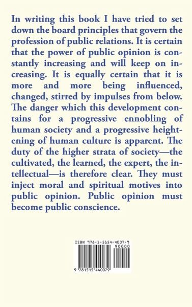 In writing this book I have tried to set down the board principles that govern the profession of public relations. It is certain that the power of public opinion is constantly increasing and will keep on increasing. It is equally certain that it is more and more being influenced, changed, stirred by impulses from below. The danger which this development contains for a progressive ennobling of human society and a progressive heightening of human culture is apparent. The duty of the higher strata of society-the cultivated, the learned, the expert, the intellectual-is therefore clear. They must inject moral and spiritual motives into public opinion. Public opinion must become public conscience.