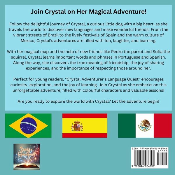 Crystal's Adventures A Language Quest Embark on an Unforgettable Journey with Crystal! Join Crystal, a curious little dog with a heart full of adventure, as she travels across the vibrant landscapes of Brazil, Spain, and Mexico in "Crystal's Adventures; A Language Quest." This delightful children's book is perfect for young readers eager to explore new cultures and languages! ���� What's Inside? 1. * Exciting Adventures: Follow Crystal as she makes new friends like Pedro the parrot and Sofia the squirrel, learning important words in Portuguese and Spanish along the way. * Fun Activities: Engage with interactive games and colorful illustrations that enhance the reading experience and encourage learning. * Valuable Lessons: Discover the true meaning of friendship, the joy of exploring new places, and the importance of respect for others. ���� Why Choose This Book? 2. * Multicultural Learning: A beautifully illustrated tale that introduces children to different languages and cultures, fostering appreciation for diversity. * Encourages Curiosity: Inspire your little ones to be explorers and learners, making education fun and enjoyable. * Perfect Gift: An ideal addition to any child's bookshelf, suitable for ages 3-8, and perfect for reading together or alone. ���� Let the Adventure Begin! With a magical map in paw and a spirit of adventure in her heart, Crystal is ready to embark on this incredible journey. "Crystal's Adventures; A Language Quest" is more than just a story-it's an invitation to explore, learn, and grow. Order your copy today and join Crystal on her adventure of a lifetime!
