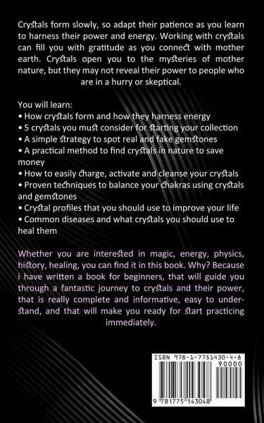 Crystals form slowly, so adapt their patience as you learn to harness their power and energy. Working with crystals can fill you with gratitude as you connect with mother earth. Crystals open you to the mysteries of mother nature, but they may not reveal their power to people who are in a hurry or skeptical. You will learn: - How crystals form and how they harness energy - 5 crystals you must consider for starting your collection - A simple strategy to spot real and fake gemstones - A practical method to find crystals in nature to save money - How to easily charge, activate and cleanse your crystals - Proven techniques to balance your chakras using crystals and gemstones - Crystal profiles that you should use to improve your life - Common diseases and what crystals you should use to heal them Whether you are interested in magic, energy, physics, history, healing, you can find it in this book. Why? Because i have written a book for beginners, that will guide you through a fantastic journey to crystals and their power, that is really complete and informative, easy to understand, and that will make you ready for start practicing immediately.
