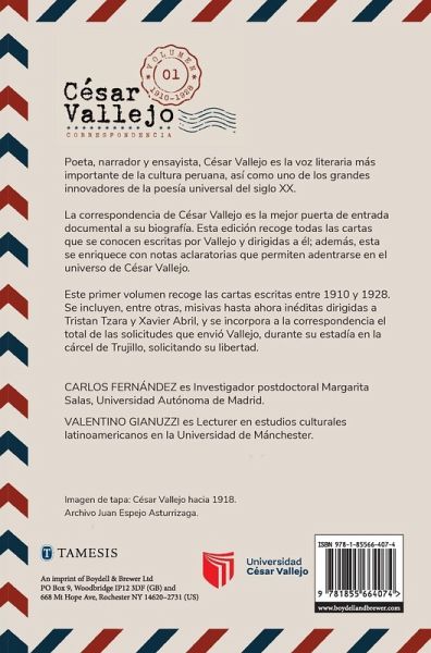 La correspondencia de César Vallejo es la mejor puerta de entrada documental a su biografía. Esta edición recoge todas las cartas que se conocen escritas por Vallejo y dirigidas a él; además, esta se enriquece con notas aclaratorias que permiten adentrarse en el universo de César Vallejo. Este primer volumen recoge las cartas escritas entre 1910 y 1928. Se incluyen, entre otras, misivas hasta ahora inéditas dirigidas a Tristan Tzara y Xavier Abril, y se incorpora a la correspondencia el total de las solicitudes que envió Vallejo, durante su estadía en la cárcel de Trujillo, solicitando su libertad. César Vallejo's correspondence is the best documentary gateway to his biography. This edition collects all the known letters written by Vallejo and addressed to him. In addition, it is enriched with explanatory notes that allow us to delve into the universe of César Vallejo. This first volume collects letters written between 1910 and 1928. It includes, among others, unpublished letters addressed to Tristan Tzara and Xavier Abril, and all of the petitions Vallejo sent from his time in the Trujillo prison, requesting his release.