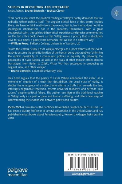 This book argues that the poetry of César Vallejo announces the event, as a moment of irruption of a truth that destabilises the usual state of reality. It studies the emergence of a subject who affirms a truth that exceeds the law, interrupts hegemonic repetition, asserts universal solidarity, and defends "lost causes" despite political failure. The author reconfigures the traditional reading of Vallejo only as a poet of pain and human suffering, and offers new ways of understanding the relationship between poetry and politics.