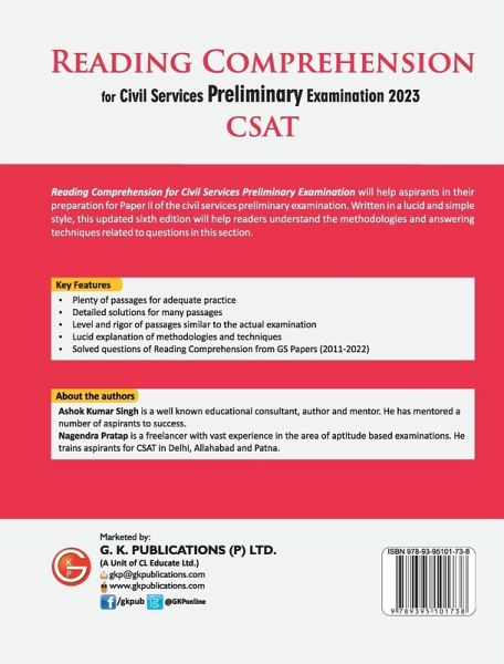Reading Comprehension for Civil Services Preliminary Examination will help aspirants in their preparation for Paper II of the civil services preliminary examination. Written in a lucid and simple style, this updated sixth edition will help readers understand the methodologies and answering techniques related to questions in this section. Plenty of passages for adequate practice Detailed solutions for many passages Level and rigor of passages similar to the actual examination Lucid explanation of methodologies and techniques Solved questions of Reading Comprehension from GS Papers (2011-2022)