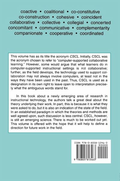 This book, about a newly emerging area of research in instructional technology, has as its title the acronym "CSCL." Initially, CSCL was chosen as an acronym for Computer-Supported Collaborative Learning. However, some would argue that "collaborative" is often not a descriptive term for what learners do in instructional settings; further, as the field develops, the technology used to support collaboration may not always involve computers, at least not in the direct ways they have been used to support instruction in the past. To avoid getting bogged down in this terminological debate, this book uses CSCL as a designation in its own right, leaving open to interpretation precisely what words it stands for. The authors talk a great deal about the theory underlying their work. In part, this is because that is what they were asked to do, but it is also an indication of the state of the field. In an established paradigm in which the theories and methods are well agreed upon, such discussion is less central. CSCL, however, has not yet reached the stage of "normal" science. There is much to be worked out yet. This book is offered with the hope that it will help to define a direction for future work in this field. The chapters appear in alphabetical order (except for the introductory chapter and the afterword) -- not for lack of a better way to organize the chapters, but rather because the organizational possibilities are too numerous and this order does not privilege one over another. By not imposing a topical organizing structure on this collection, it is hoped that readers will feel freer to explore the chapters in a way that best suits their needs. COPY FOR BIND-CARD CD-ROM info ................................. There is an accompanying CD-Rom for this proceedings that will become available September 1998. Purchasers of the proceedings may obtain a copy of this CD-ROM at no cost by contacting Lawrence Erlbaum Associates, Inc. phone: (201) 236-9500 toll-free: 1-800-9-BOOKS-9 (1-800-926-6579) 9am-5pm EST fax: (201) 236-0072 e-mail: orders@erlbaum.com Web site: www.erlbaum.com address: 10 Industrial Avenue, Mahwah, NJ 07430-2262 The CD-ROM was funded through a grant from the National Science Foundation.