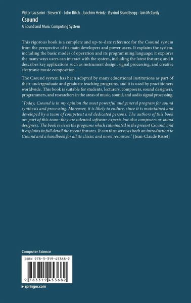 The Csound system has been adopted by many educational institutions as part of their undergraduate and graduate teaching programs, and it is used by practitioners worldwide. This book is suitable for students, lecturers, composers, sound designers, programmers, and researchers in the areas of music, sound, and audio signal processing.